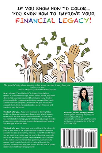 Personal finance, money management, business & economics, credit reports, FICO scores, the cost of credit… each impacts our lifestyle and financial decisions, yet far too few Americans are aware of little-known secrets to our credit scoring system. Even fewer adults know it is easier than they imagine to effectively re-build credit, quickly and without a lot of pain—with the right help. Expert Alisa Glutz has a proven method to “color” credit; she is passionate to create a movement where people everywhere can take advantage of a fun, but effective approach, to repair bad credit that stems from life events such as identity theft, bankruptcies, personal financial upsets, and myriad unknowns that negatively impact vital financial opportunities. If you have ever wondered any of those things, then don’t worry; you have come to the right place. Color My Credit will answer all your questions—and even some you don’t know to ask!Her new release, Color My Credit, is designed to enlighten readers; compiled with tips, insider secrets, and advice and action steps to help you repair your credit quickly and easily. It is the ultimate guide for readers drowning in the despair of bad credit. It is designed to remove the guilt and trauma associated with limited choices based on low credit scores, and transform your life forever.Glutz helps you make course corrections in spending, credit errors, debt ratios, etc.—all of which can ultimately help you save thousands of dollars in interest paid, interest rates, and myriad other financial choices that are all predicated by your credit score.Awareness equals choices. The information in Color My Credit is timely; we are coming out of a long seven-year stretch where people had little opportunity to modify their damaged scores. The author is bold in her assertions of what can happen next for you, if you but step into the arena, learn the credit laws that both protect and impact you, and take advantage of the changing tides that are occurring now. In addition to the print version of the book, readers are encouraged to download a complimentary workbook that includes sample credit reports, forms, templates, letter samples, and other helpful tools to participate in this great Color My Credit Movement! This book is for you… if you have mediocre to downright bad credit—or, like many consumers—have no idea what is on your credit report because you are too afraid to look. It is for you if you want to better manage your credit to take advantage of better employment, reduced insurance costs, better pricing on banking and mortgage loans and more.This book is for you… if you have only an inkling of how the role credit plays in your financial life. Improved credit scores can open the doors for the best of everything financial. Color My Credit helps you put together and action plan not only for boosting your credit score, but learning exactly what steps are necessary to maintain it. The author answers many critical questions, such as how to request credit reports from the three nationwide reporting agencies, understanding why your score is low, and how to quickly recolor your credit score (FICO) picture!ADVANCE PRAISECredit… A subject we all know is important, but let’s face it, how many of us actually want to know about and /or take the time to improve our credit score? Color My Credit by Alisa Glutz, lets us know that it can be done, one just needs to begin, take things step by step as outlined in her book and big things can and will happen. Whether it just be making a marked improvement in one’s score all the way up to buying that dream home. The relationship of credit to one’s overall, ongoing financial plan is so important. What’s comforting is knowing that there is someone like Alisa that has the unique combination of knowledge, know-how, and desire to help others.Matthew C. MunnRegistered Investment AdvisorFirst Financial Equity Corporation