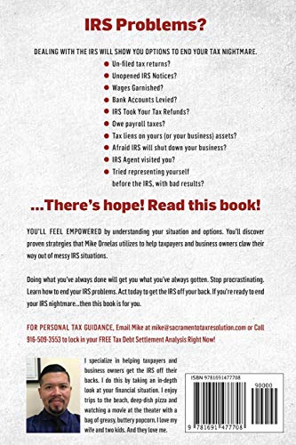 IRS Problems? Dealing with the IRS will show you options to end your tax nightmare.Un-filed tax returns? Unopened IRS notices? Wages garnished? Bank accounts levied? IRS took your tax refunds? Owe payroll taxes? Tax liens on yours (or your business) assets? Afraid IRS will shut down your business? IRS Agent visited you? Tried representing yourself before the IRS, with bad results? There’s hope! Read this book! YOU’LL FEEL EMPOWERED by understanding your situation and options. You’ll discover proven strategies that Mike Ornelas utilizes to help taxpayers and business owners claw their way out of messy IRS situations.Even if you’re a tax dummy, this book proves that taxes CAN be made simple. It’s filled with ways to lower your taxes. You’ll get your taxes explained in this short book. Doing what you’ve always done will get you what you’ve always gotten. Stop procrastinating. Learn how to end your IRS problems. Act today to get the IRS off your back.If you’re ready to end your IRS nightmare…then this book is for you.