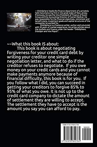 ***SECOND EDITION***This book IS about negotiating forgiveness for your credit card debt by writing your creditor one simple negotiation letter and what to do if the creditor refuses to negotiate. If you owe money on your credit cards and cannot make payments anymore because of financial difficulty, this book is for you. I owed over $100,000 in credit card debt and the debt was hurting my life. I had trouble sleeping at night thinking how long my ever-increasing debt would continue to gnaw at me. Even if I could afford to make the minimum payments and do not borrow anymore, with interest of 25% APR, I will still owe a lot of money after many years of making only minimum payments. The interest alone would total close to $100,000. It took a year of trial and error, hours on the phone and writing meaningless letters most of which I copied from the internet before I saw the light at the end of the tunnel. None of the free advice and letters in the internet worked because the truth is I was not insolvent. I did not qualify for bankruptcy protection. I could have paid my credit card debt by liquidating my assets, selling my house, but that would have been devastating for my family. I kept on thinking of a way for my creditors to reduce my debt. I finally came up with The Letter that uniformly worked in negotiating down my debt. After mailing The Letter to my creditors, I received a reply from one of them offering to accept 50% of what I owed as full payment of my debt. I countered with 5%. We finally agreed on 10% of the original amount as full and final settlement of my balance. Considering I had not paid them for a year, I accumulated a little cash, so I was happy to grab the offer and pay the 10%. I had five credit cards with large balances and The Letter worked satisfactorily on four of the accounts. I settled the 4 accounts for between 5% and 15%. The last hold-out, surprisingly the account with the smallest balance at $13,000 chose to take me to arbitration. This negotiation-resistant creditor perceived that they might collect more money from me that way but they were wrong. I was surprised that not one of the 4 creditors even referred to the contents of The Letter or attempted to verify what I had written in the letter. The Letter aims to convey this message: “Take my final settlement offer or sue me. But if you sue me, you will lose”. Ken Clark, author of The Complete Idiot’s Guide to Getting Out of Debt: “So many people are trying to get their balances reduced, you call and try to negotiate a balance, and it’s ‘Get in line.'” The card company’s attitude may be, “Yeah, you and everybody else””. My Comment – That’s because you called to negotiate instead of sending them The Letter shown at the end of this chapter. Trust me there aren’t that many accounts in default as a percentage of the whole or our banking system would collapse. If you write The Letter shown at the end of this chapter, the creditor will put you at the front of the line. Brian Tawney, Director of Clear One Advantage: “Based on experience negotiating with creditors, debt settlement companies know what percentage of debt owed each creditor is likely to agree to. We use an algorithm that considers 140 different variables and tells us the accounts that have the highest opportunity to settle at any given time. We negotiate in bulk. We can negotiate thousands of cases and get a better settlement for everyone”. Translation: Debt Settlement Agencies take only the easy cases that’s why they “negotiate in bulk”. If they have to spend more time on your case because you have wages a creditor can garnish and assets they can put a lien on, they will not take your case. I like my system better. You write The Letter shown at the end of this chapter which begs creditors to forgive 85% to 95% of your debt. The creditors can take it or leave it. If they take it, you win. If they leave it, they lose. Author’s website: www.didosphere.com